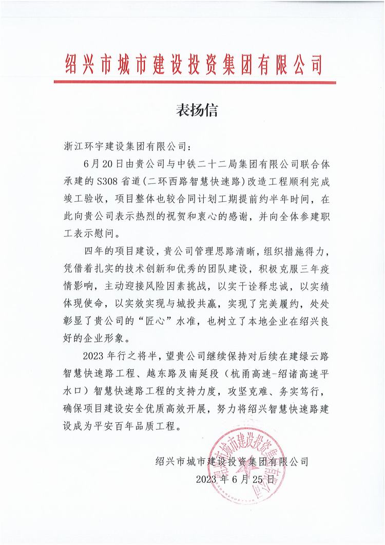 【概要描述】近日,我司收到來自紹興市城市建設(shè)(shè)投資集團(tuán)有限公司的表揚(yáng)信。信中對(duì)環(huán)(huán)宇集團(tuán)與中鐵二十二局集團(tuán)有限公司聯(lián)(lián)合體承建的S308省道(二環(huán)(huán)西路智慧快速路)改造工程順利完成竣工驗(yàn)收表示了熱烈的祝賀和衷心的感謝,并向項(xiàng)目全體參建人員表示慰問。
