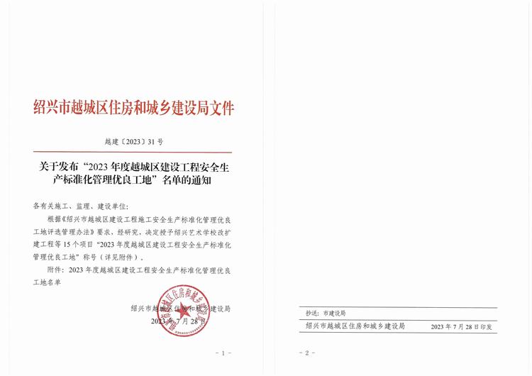 紹興市越城區(qū)住房和城鄉(xiāng)建設局發(fā)布《關于發(fā)布“2023年度紹興市越城區(qū)建設工程安全生產(chǎn)標準化管理優(yōu)良工地”名單的通知》,由我司承建的陽明故里整體開發(fā)建設項目--陽明故居及紀念館被評為“2023年度紹興市越城區(qū)建設工程安全生產(chǎn)標準化管理優(yōu)良工地”!