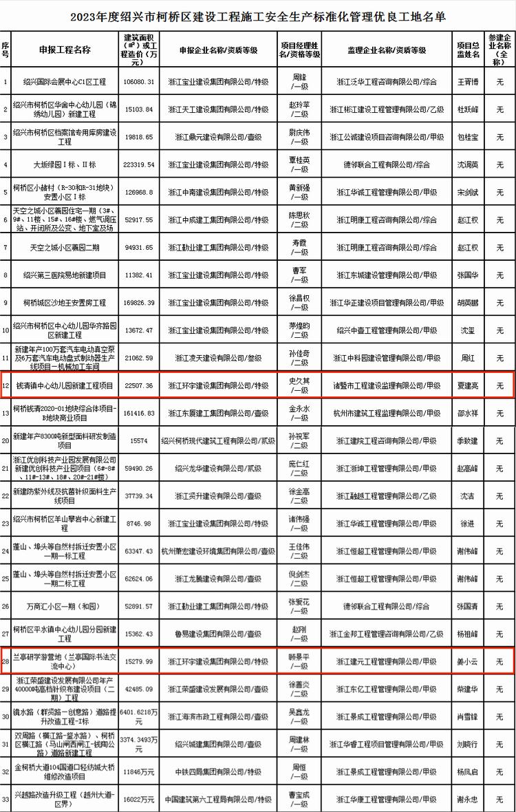 紹興市柯橋區(qū)住房和城鄉(xiāng)建設局發(fā)布《關于公布2023年度紹興市柯橋區(qū)建設工程施工安全生產(chǎn)標準化管理優(yōu)良工地名單的通知》,由我司承建的錢清鎮(zhèn)中心幼兒園新建工程項目和蘭亭研學游營地(蘭亭國際書法交流中心)兩個項目被評為“2023年度紹興市柯橋區(qū)建設工程施工安全生產(chǎn)標準化管理優(yōu)良工地”!