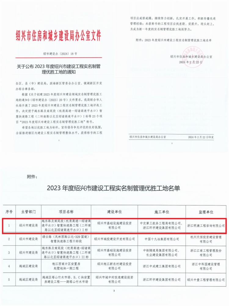 , mobileContent=近日,紹興市住房和城鄉(xiāng)建設(shè)局公布2023年度紹興市建設(shè)工程實名制管理優(yōu)勝工地,我司與中交三航局聯(lián)合承建的越東路及南延段智慧快速路工程二期I標(biāo)項目獲此榮譽。