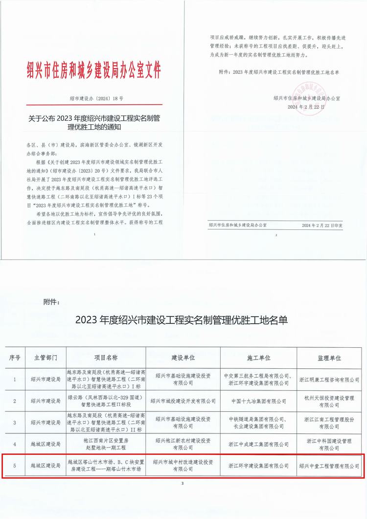 , mobileContent=近日,紹興市住房和城鄉(xiāng)(xiāng)建設(shè)(shè)局發(fā)(fā)布了紹市建設(shè)(shè)辦【2024】18號(hào)文件《關(guān)(guān)于公布2023年度紹興市建設(shè)(shè)工程實(shí)名制管理優(yōu)(yōu)勝工地的通知》,我司越城區(qū)(qū)塔山竹木市場(chǎng)、B、C塊安置房建設(shè)(shè)工程在本次評(píng)選中榮獲“2023年度紹興市建設(shè)(shè)工程實(shí)名制管理優(yōu)(yōu)勝工地”稱號(hào)。