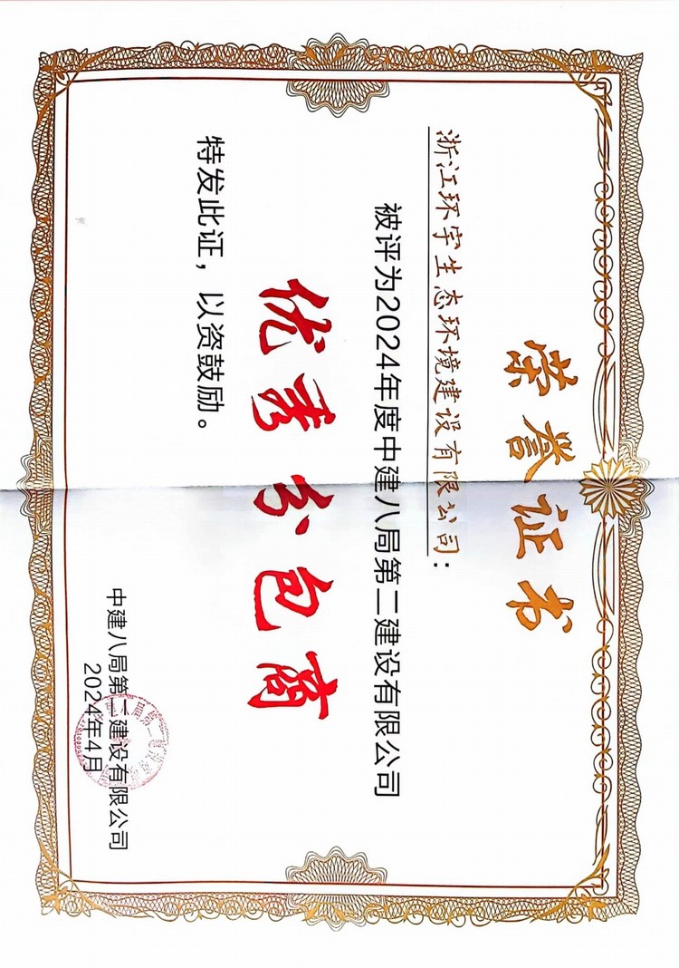 【概要描述】近日,環(huán)(huán)宇集團(tuán)(tuán)下屬子公司浙江環(huán)(huán)宇生態(tài)(tài)環(huán)(huán)境有限公司獲得中建八局第二建設(shè)(shè)有限公司頒發(fā)(fā)的2024年度“優(yōu)(yōu)秀分包商”榮譽(yù)(yù)稱號。