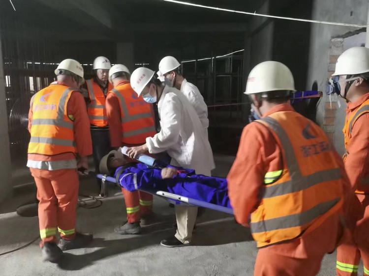 此次演練搶救小組包括保衛(wèi)組、搶險(xiǎn)組、聯(lián)絡(luò)組、救護(hù)組、后勤組、機(jī)動(dòng)組。主要內(nèi)容為工人擅自進(jìn)入地下室有限空間作業(yè),因有限空間內(nèi)通風(fēng)不暢、含氧量不達(dá)標(biāo)導(dǎo)致工人窒息昏迷。施工現(xiàn)場(chǎng)負(fù)責(zé)人得知事故發(fā)生后,立即組織各搶救小組啟動(dòng)搶救程序。保衛(wèi)組對(duì)現(xiàn)場(chǎng)做好警戒圍擋,叫走無(wú)關(guān)圍觀人員,嚴(yán)禁圍觀人員拍照;后勤組先對(duì)現(xiàn)場(chǎng)救援條件做判斷,使用氣體檢測(cè)儀對(duì)周邊環(huán)境氣體進(jìn)行檢測(cè),不符合要求的場(chǎng)所嚴(yán)禁人員進(jìn)入,同時(shí)接好大功率機(jī)械通風(fēng)設(shè)備對(duì)有限空間進(jìn)行通風(fēng);搶險(xiǎn)組穿戴好救援個(gè)人防護(hù)裝置,迅速將昏迷人員救出,脫離現(xiàn)場(chǎng),轉(zhuǎn)移至通風(fēng)良好和有新鮮空氣的地方;救護(hù)組對(duì)傷者進(jìn)行檢查,對(duì)傷者進(jìn)行緊急心肺復(fù)蘇,經(jīng)過(guò)搶救傷者蘇醒,項(xiàng)目經(jīng)理認(rèn)定受傷人員已蘇醒,傷勢(shì)尚可,可由項(xiàng)目部應(yīng)急車輛送至醫(yī)院,于是搶救組將傷者用擔(dān)架固定,抬到提前準(zhǔn)備好的應(yīng)急車輛上,醫(yī)療救援組上應(yīng)急車輛一路陪同送至醫(yī)院治療。