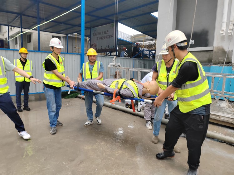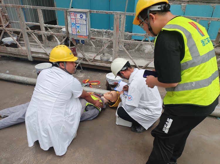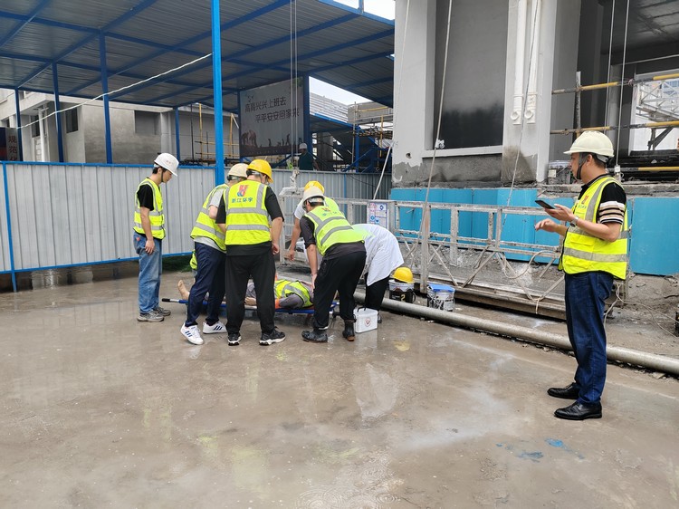 隨著本次演練指揮長(zhǎng)吳總一聲令下,演練正式開始。本次應(yīng)急演練主要流程為吊籃操作工違規(guī)作業(yè),不慎從吊籃上墜落,項(xiàng)目經(jīng)理得知消息后,立即組織各應(yīng)急小組啟動(dòng)搶救程序。救護(hù)組對(duì)現(xiàn)場(chǎng)做好警戒圍擋,嚴(yán)禁圍觀人員拍照;醫(yī)療組檢查傷者情況,當(dāng)即判斷必須盡快送至醫(yī)院;指揮組安排應(yīng)急車輛進(jìn)場(chǎng),后勤組對(duì)接就近醫(yī)院安排傷員接收事宜;救護(hù)組將傷者轉(zhuǎn)移到應(yīng)急車輛上,過程中防止傷者二次受傷,醫(yī)療組隨車陪同送至醫(yī)院治療。